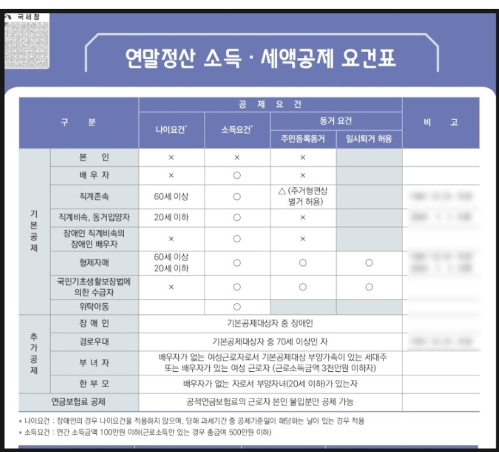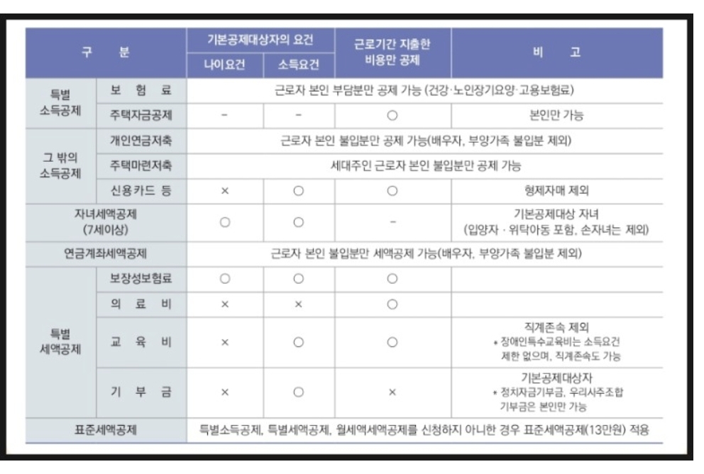 기본공제 대상자의 의료비, 교육비, 보험료, 기부금, 신용카드는 나이, 소득요건이 다르게 적용되니 확인하시고 공제받으시기 바란다.