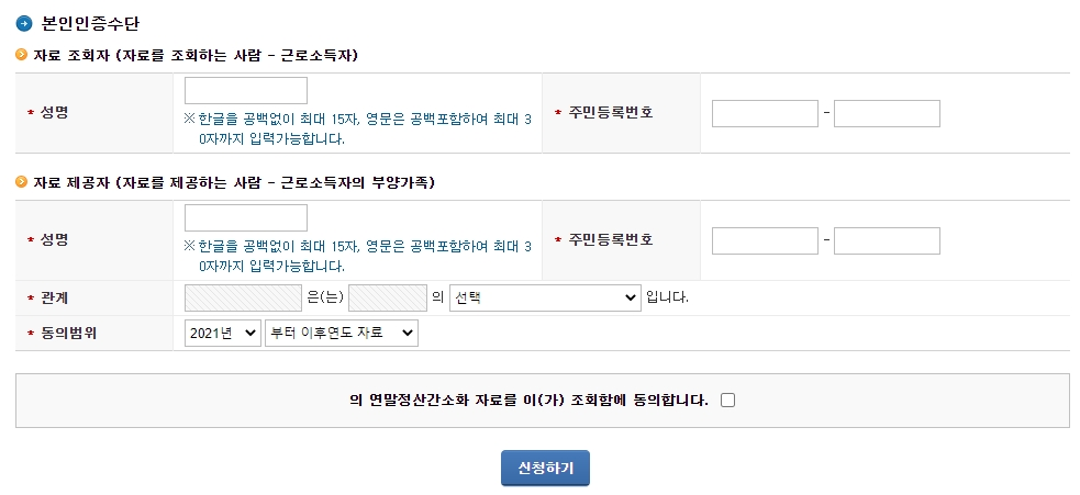 본인인증수단이 있는 경우는 바로 하단에 자료를 입력하고 신청하기를 눌러주시면 됩니다. 자료 조회자는 연말정산을 받는 사람의 정보 즉 근로자의 정보를 입력하시면 됩니다.