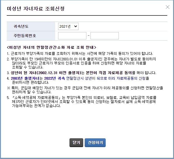 다만 성년이 된 자녀의 경우는(2002년 12월 31일 이후 출생자) 본인이 직접 자료제공 동의를 신청해야 합니다. 연말정산 미성년자 부양가족 등록방법은 사실 어렵지 않습니다. 별도로 자녀의 동의 없이 부모님의 동의만 있으면 가능합니다.